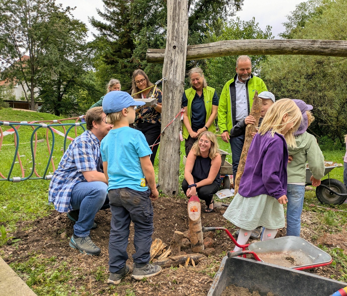 Anett Röling, die beim Jugendhilfswerk Freiburg e.V. den Bereich Frühpädagogik leitet, berichtete vor Ort über Erfolge und Stolpersteine rund um die Kindertageseinrichtungen des Stadtgebietes. Kita-Leiter Alexander Seitz und sein Team führten durch die Einrichtung, die vor allem durch ihr großzügiges Außengelände bei Kindern und Eltern punktet. Er ist naturnah gestaltet und für Falter und andere Tiere richten die Kinder auch schon mal ein eigenes „Naturschutzgebiet“ ein. Ebenso findet draußen ein eigener Garten Platz. Praktische Einblicke gab es in das Projekt „Das Leben der Bienen“, das unter anderem durch „Upcycling“ eines morschen hölzernen Klettergerüstes umgesetzt wird. Dort zeigten die Kinder, wie sie Käferburgen, Krabbeltierkisten und Wildbienenhotels aus dem bestehenden Material bauen. Solche BNE-Projekte sind fest im Konzept der Naturpark-Kindergärten verankert und seit diesem Jahr auch wesentlicher Bestandteil des Orientierungsplans für Kindergärten in Baden-Württemberg.