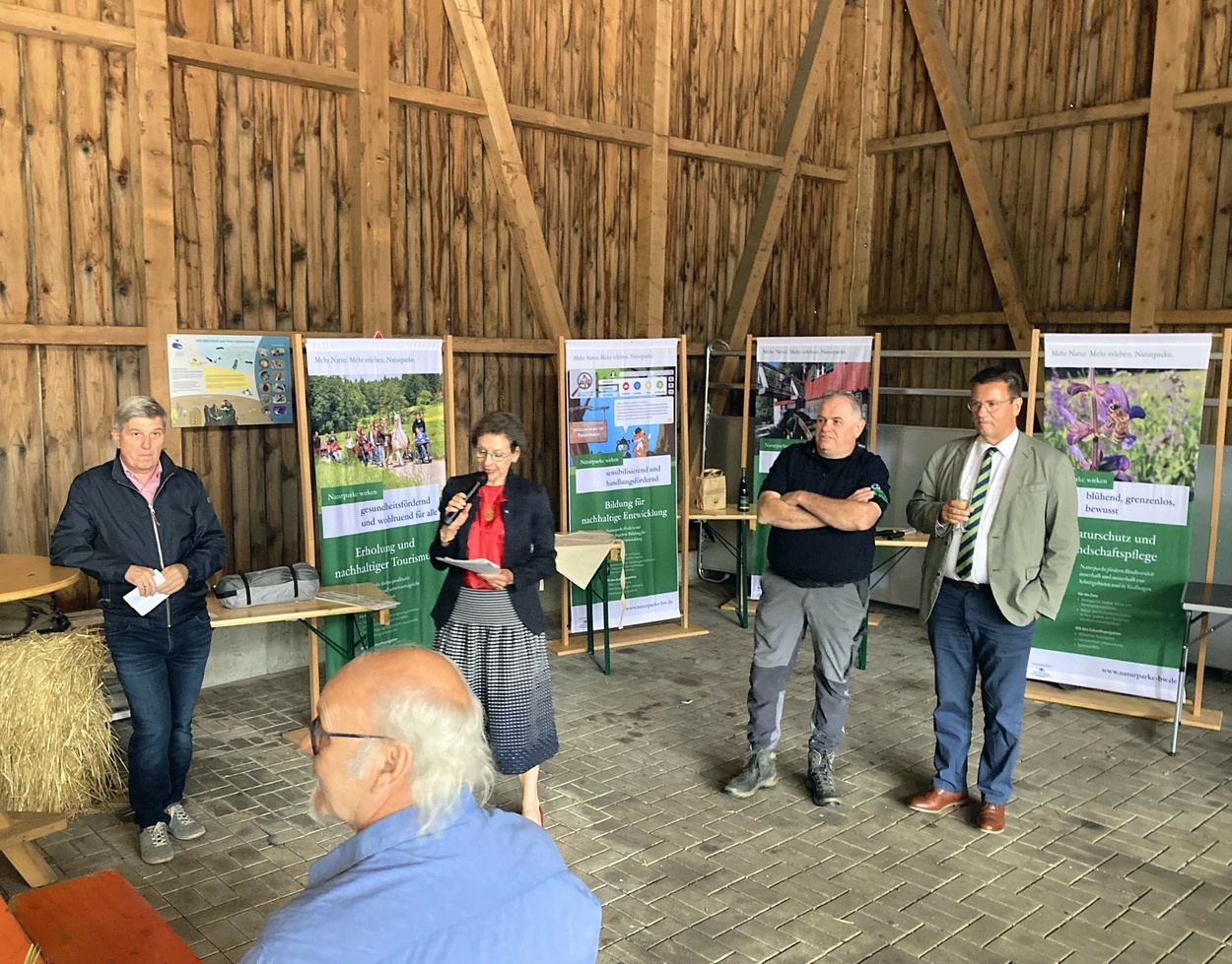 Exakt 20 Jahre später feierte die AG Naturparke Baden-Württemberg nun ihr Jubiläum. Veranstaltungsort war der Goldbachhof in Bernau, der den 50 Gästen regionale Leckereien und Gutes vom Schwarzwald Bio-Weiderind bot. Gemeinsam mit Partnerinnen und Partnern sowie langjährigen Weggefährtinnen und -gefährten blickte man auf zwei ereignisreiche Jahrzehnte der Naturpark-Arbeit zurück. Landrätin Marion Dammann, Sprecherin der AG Naturparke Baden-Württemberg und Vorsitzende des Naturpark Südschwarzwald e. V., nahm gemeinsam mit Landrat Stefan Bär, stellvertretender Sprecher der AG Naturparke Baden-Württemberg und Vorsitzender des Naturpark Obere Donau e. V., die Teilnehmenden mit auf eine Zeitreise und berichtete von den Höhen und Tiefen, den Herausforderungen und einem starkem, gemeinsamem Wachstum: „2005 waren die sieben Naturparke auf 30 Prozent der Landesfläche vertreten, 2025 sind es bereits über 36 Prozent. Dies zeigt: Naturparke wirken auf der Fläche. Unsere kommunalen Mitglieder profitieren vom jeweiligen Naturpark im ländlichen Raum und tragen aktiv zur nachhaltigen Entwicklung der Naturpark-Regionen bei. Mit Projekten und Initiativen der Naturpark-Mitglieder und der Naturpark-Vereine wie den Blühenden Naturparken, den Naturpark-Märkten, den Naturpark-Schulen oder den Wanderleitsystemen tragen die Naturparke zur Erreichung strategischer Zielsetzungen auf Landes- und Bundesebene bei “, so Dammann. Heute sind 430 Städte und Gemeinden sowie 37 Stadt- und Landkreise Mitglieder in den sieben Naturpark-Vereinen. Die Projekte der sieben Naturparke sind in den Bereichen Naturschutz und Landschaftspflege, nachhaltiger Tourismus und Erholung, Bildung für nachhaltige Entwicklung und nachhaltige Regionalentwicklung eingegliedert.
